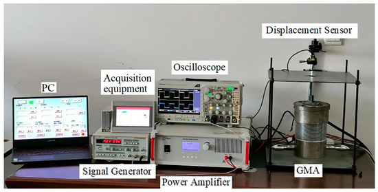 In order to obtain the hysteresis input–output data required for the identification model, a giant magnetostrictive actuator test bench is built, as shown in Figure 5. The experimental bench mainly includes: the giant magnetostrictive actuator, YB1635 signal generator, NI-usb6211 acquisition card and display device, Aigtek-ATA309 power amplifier, Panasonic HG-C1030 laser displacement sensor, and PC and Tektronix-MDO3014 oscilloscope. Among them, the signal generator generates a positive rotating AC signal, which is amplified by the power amplifier to drive the vibration of the super magnetostrictive actuator with a suitable excitation current. The laser displacement sensor, oscilloscope, acquisition card, and display device cooperate with the PC to complete the display, acquisition, processing, and post-analysis of data.