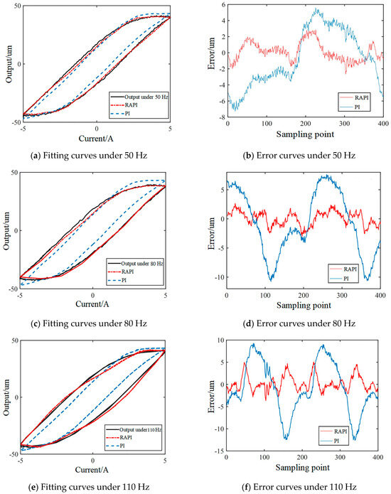 The experimental curves at 50, 80, and 110 Hz were randomly selected and compared with the curves acquired by the PI model and the RAPI model. The fitting error curves of the two models are shown in Figure 6. It could be observed from the fitting curves of the two models that the RAPI model curves introduced with a frequency function could accurately fit the hysteresis curve of the giant magnetostrictive actuator at variable frequencies. The error curve diagram shows that the PI model fails to describe the rate-related characteristics. As a result, as the frequency increases, the output error values gradually increase. After the RAPI model is improved with rate correlation, the output error values at different frequencies remain relatively stable, indicating a significant improvement in the fitting accuracy of the RAPI model for the variable frequency output curve of the magnetostrictive actuator.