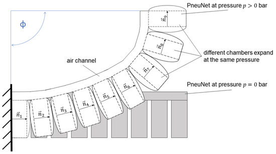 - Liu, Y.; Chen, W.; Xiong, C. Simulation and fabrication of a pneumatic network actuator with capability of bending in multi-planes. In Proceedings of the 2019 IEEE/ASME International Conference on Advanced Intelligent Mechatronics (AIM), Piscataway, NJ, USA, 8–12 July 2019; pp. 313–317. [Google Scholar] [CrossRef]