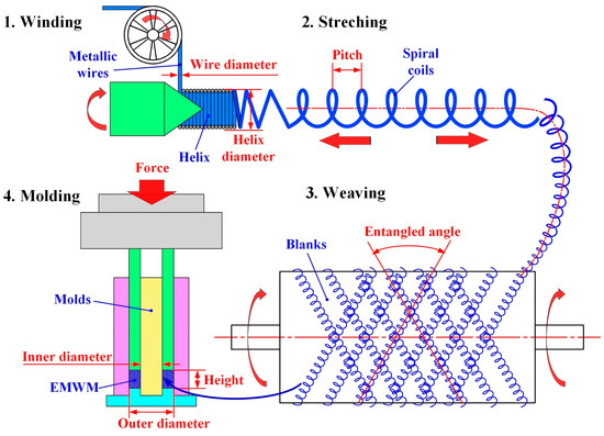 The metallic wires used in the production of EMWM were supplied by Anping Risheng Wire Mesh Ltd., in Hengshui, China. These wires are made of stainless steel, specifically the grade 0Cr18Ni9. The manufacturing process of EMWM specimens followed the procedures illustrated in Figure 1. Initially, the metallic wires were tightly wound to form closely spaced helixes using a wire winding machine. Subsequently, the helixes were stretched into spiral coils according to the pitch parameter. These coils were then woven together manually to create a blank. Finally, the blank was cold-pressed into EMWM specimens of the desired shape using molds and a press machine.