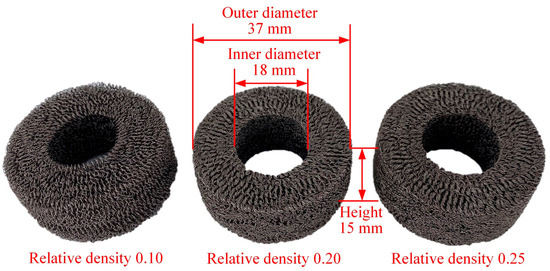 Relative density, , is a critical design parameter that significantly affects the mechanical properties of EMWM. It quantifies the volume fraction of coiled wires within the entire specimen and is defined by Equation (1). Some studies also uses the term “porosity” to describe the porous characteristics of EMWM.