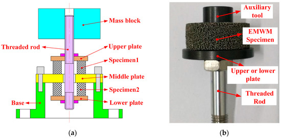 A vibration isolation structure was designed to replicate the working conditions of general isolators to subject the EMWM specimens to an identical vibration environment, as illustrated in Figure 3a. A pair of EMWM specimens with the same parameters set were tested within the isolation structure. The components of the isolation structure, from top to bottom, included a mass block, threaded rod, upper plate, specimen 1, middle plate, specimen 2, lower plate, and base. The installation of an EMWM specimen onto the threaded rod and plate is illustrated in Figure 3b. An auxiliary tool was used to align the central axis of the specimen with the threaded rod. During the installation process, the threaded rod and nut were tightened to achieve an initial compression deformation of the EMWM specimens. Thread adhesive was used to securely fasten the threaded rod and nut, preventing any loosening during the vibration experiment. The initial deformation was set at 0.5 mm, controlled by the distance between the upper plate and the lower plate. The isolation structure maintained the EMWM specimens in a compressed state throughout the vibration experiment, consistent with the stress state in a general isolator. When the mass block induced a downward displacement relative to the threaded rod, the upper specimen (specimen 1) underwent compression. When the mass block induced an upward displacement, the lower specimen (specimen 2) underwent compression.