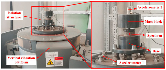 The vibration experiments were conducted using the DC-1000-15/SV-0606 electric vibration testing system provided by Sushi Experimental Instrument Co., Ltd., Suzhou, China. The experimental setup for the vibration experiment is illustrated in Figure 4. The isolation structure was mounted on the vertical vibration platform using four bolts. Two accelerometers were employed to capture the vibration excitation signal and response signal of the isolation structure. Accelerometer 1 was attached to the vibration platform. Accelerometer 2 was attached to the top of the mass block. The platform generated vertical vibrations, and the frequency and amplitude were controlled by a computer.