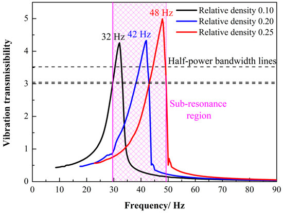 Resonance transmission rate of isolation structure with specimens of different relative densities.