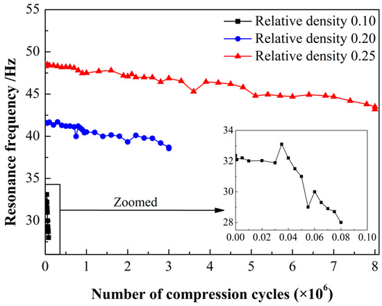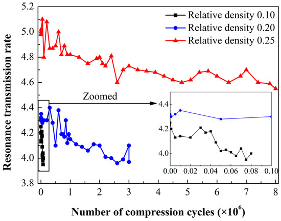 where and represent the acceleration of the vibration platform and the mass block, respectively. The results indicate that the resonant frequency and transmission rate of the isolation structure decrease with an increasing number of compression cycles. These observations are illustrated in Figure 9 and Figure 10, respectively. It is noteworthy that the EMWM specimens with lower relative densities exhibit a more rapid deviation of the isolation structure from its designed mechanical performance, consequently shortening the operational lifetime.