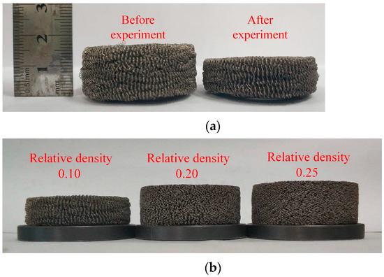 Following the completion of the compression cycles, the EMWM specimens were extracted from the isolation structure to visually inspect their geometric and morphological features. The appearance of the EMWM specimens with different relative densities after compression cycles is shown in Figure 11. The specimens retained their cylindrical shape, with minimal alterations in their cross-sectional dimensions. No fractures or significant wear of the metallic wires were observed on the surface of the EMWM specimens. However, a noticeable decrease in height along the compression direction was evident, accompanied by the occurrence of gaps within the isolation structure. This finding indicates that the vibration environment induces irreversible deformation in the compression direction of the EMWM specimens.