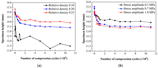 The variation in specimen height: (a) for different relative densities with a stress amplitude of 0.3 MPa, (b) with a relative density of 0.25 under different stress amplitudes.