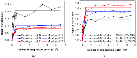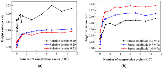 The height variation rates of specimens: (a) for different relative densities and (b) under different compressive stress amplitudes.