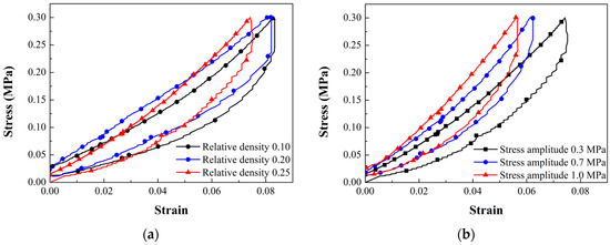 Following the dimensional measurements, quasi-static compression tests were conducted to determine the mechanical properties of the EMWM specimens, including the secant modulus and loss factor. The maximum compressive stress applied to the specimens was maintained at 0.3 MPa, aligning with the practical load conditions experienced by isolators. The compression process was almost exclusively confined within the linear elastic range of EMWM. Multiple measurements were conducted for each state, and the mechanical properties of the EMWM specimens exhibited remarkable consistency. The stress–strain curves after the last vibrational compression cycle are illustrated in Figure 15. The influences of the relative density and compressive stress amplitude are investigated to enhance EMWM’s feasibility for engineering applications.