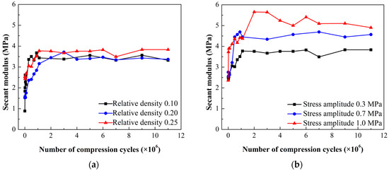 The variation in secant modulus: (a) for different relative densities at a stress amplitude of 0.3 MPa and (b) at a relative density of 0.25 under different stress amplitudes.