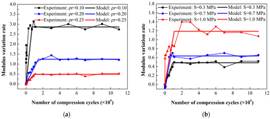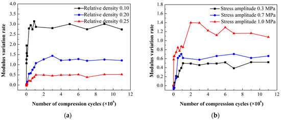 The modulus variation rates of specimens: (a) for different relative densities and (b) under different compressive stress amplitudes.
