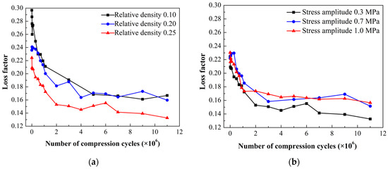 - The secant modulus exhibited a significant increase, while the loss factor decreased as the number of compression cycles increased. Once the cycle number reached a threshold value of approximately 106, these parameters stabilized at relatively constant values. The values of these properties were influenced by the relative density and stress amplitude.