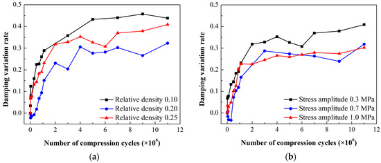 The damping variation rate of the specimens (a) for different relative densities and (b) under different compressive stress amplitudes.