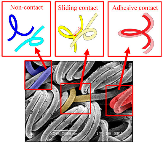 As illustrated in Figure 20, the scanning electron microscope images of the EMWM reveal that the contact states between internal metallic wires can be classified as non-contact, sliding contact, and adhesive contact. When subjected to compression loads, the contact states among metallic wires transition from non-contact to sliding contact and gradually evolve into adhesive contact, resulting in an increased number of contact points within the EMWM. The progression of contact points is substantiated by the numerical simulation results in Reference [35].