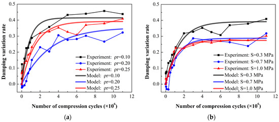 The experimental results shown in Figure 19 indicate that the curves of the damping variation rate exhibit the charactistics of exponential characteristics with an increasing number of compression cycles. These observations can be effectively described by employing an exponential function model to predict the damping of EMWM specimens. Hence, the fundamental expression of the damping prediction model can be formulated as follows: