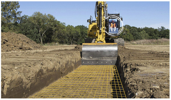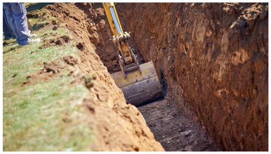 A trenching operation involves using an excavator to dig trenches in the ground for the installation of underground utilities, such as water and sewer pipes. The operator uses the excavator to dig into the ground and create a trench corresponding to the desired size and depth. Several parameters can significantly influence the productivity of an excavator in the trenching operation, such as the size and capabilities of the excavator, the type and condition of the ground, the operator’s skill and experience, the depth and width of the trench, and the type and size of the bucket. For the trenching operation, contractors typically estimate the productivity in terms of the linear length of the trench per unit of time [11,12,13]. The trenching operation using an excavator is shown in Figure 3. In this paper, the length of the trench per unit of time is utilized as the productivity definition in the trenching operation: