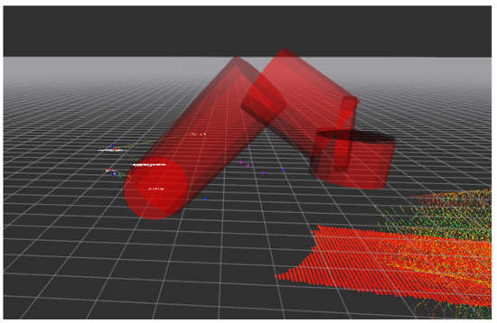The next step is to model each link as a simple cylinder. A cylinder’s axis is a line connecting two adjacent coordinate systems. The radius of all cylinders is considered equal to a constant value. Figure 6 depicts the schematic of the modeled boom, arm, and bucket. The points that overlap the cylinders and point clouds are eliminated, and the remaining points are then utilized in the elevation terrain mapping algorithm. Sometimes, when the bucket is close to the ground surface, some points that belong to the ground are removed. However, there is no challenge because when the bucket moves away from the surface, the area can be seen and added to the height map.