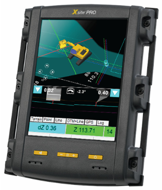 Nowadays, construction projects can be facilitated by the integration of BIM and machine control systems, e.g., Xsite® PRO 3D. In Figure 7, the Xsite® PRO 3D system is shown. Using machine control systems, the operator can quickly and accurately complete the task by comparing the bucket tip position with the target model. Target models are designed by construction professionals using 3D design software programs.