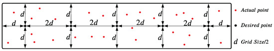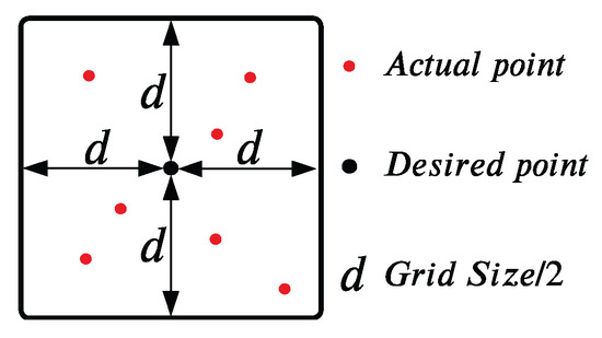 In the grading operation, the difference between the initial and target surfaces should be less than the height of the bucket because if it is greater, the digging operation should be carried out first. In the proposed method, the first step is to select a region of interest (commonly abbreviated as ROI) around the ith point of the desired model. The point is located in the center of the ROI, which is regarded as a square. The square is the same size as the grid size of the target model. The next step is to search for the actual points inside the defined ROI. In Figure 8, a simplified schematic of desired and actual points inside an ROI is shown.