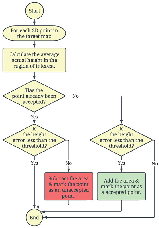 In the presented technique, the area of ROI is added to the productivity calculation when the point has not yet been classified as a valid point and the error between the actual and desired height values is smaller than the required accuracy. Further, the actual height of a point that has been already approved as a valid point should be checked because it may change. When the error exceeds the required accuracy, the point is labeled an unaccepted point, and the area of ROI must be deducted from the productivity calculation. This condition may result in negative productivity, meaning that the error exceeds the threshold.