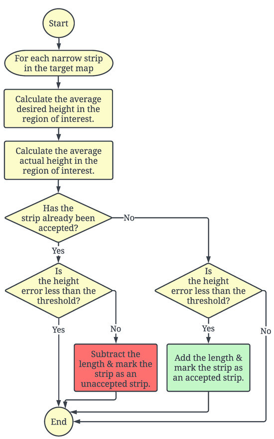 In the presented algorithm, the length of a strip is added to the productivity estimation if the strip has not been already accepted as a valid strip and the error between the average actual and desired heights is less than the required accuracy. Also, the actual height of strips that have been already accepted as valid strips must be checked since the height may change. If the error increases to higher than the required accuracy, the length of the strip is subtracted from the productivity estimation, and the strip is marked as an unaccepted strip. In this case, the error exceeding the required accuracy can cause negative productivity.