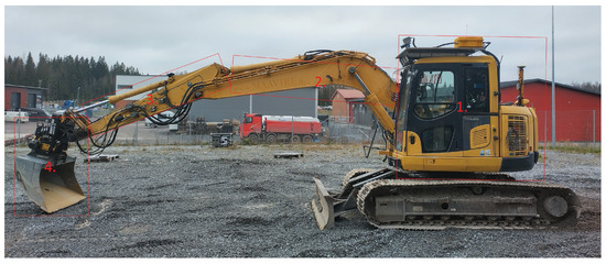 In the tests, the data were gathered using a Komatsu® PC138US excavator. The crawler excavator used in the experiments is shown in Figure 12. Although the excavator is old, regular maintenance and inspections have been performed every 500 working hours, so it has been kept in good condition. The bucket is attached to the arm via a quick coupler, and the excavator uses a tiltrotator. According to the Society of Automotive Engineers (SAE) standard, the heaping bucket capacity is 0.37 m.