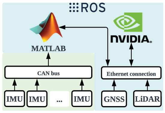 Robot Operating System (ROS) and the MathWorks Simulink® model are employed to collect measurements from the excavator. The ROS is a communication interface that provides full compatibility between programs written in different languages and running on different platforms [43]. This communication framework allows various components to access various measurements and variables, such as the height map and the positions of the revolute joints. The schematic of different connections between different sensors and processors is demonstrated in Figure 13. In this structure, an NVIDIA® Jetson AGX Xavier serves as the ROS master, and the Simulink® generates and links its own ROS node to it. Measurements of IMUs are sent over the controller area network (CAN) bus at a sampling rate of 200 Hz. To connect Simulink® to the CAN bus, a Kvaser leaf light CAN to USB interface is utilized. An ethernet connection is used to connect the LiDAR, GNSS, NVIDIA® Jetson AGX Xavier, and Simulink® to the ROS framework. The configuration of the IMUs, GNSS, Xsite® PRO 3D, and LiDAR sensor on the excavator is shown in Figure 14.