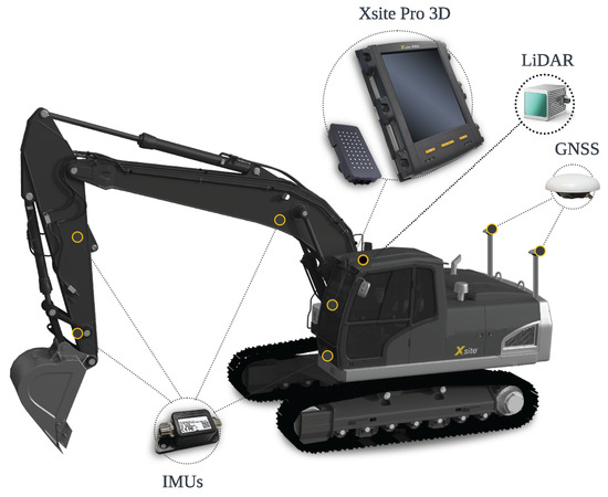 The configuration of IMUs, GNSS, Xsite® PRO 3D, and LiDAR sensor on the excavator [4].