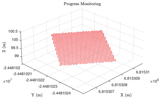 Firstly, a surface is designed as a target model in the grading operation by the human operator using the Xsite® PRO 3D inside the cabin of the excavator. In the next step, the 3D-Win® software program is utilized to obtain a 3D point cloud. The 3D point cloud of the desired model in the grading operation is shown in Figure 15. The desired model is a roughly 3 m × 4 m rectangular surface. The desired surface is 50 cm deeper than the ground surface, and the slopes of the desired surface and the initial terrain are both equal to zero. In the operation, the required accuracy of the BIM model and the grid size of the point cloud are equal to 10 cm.