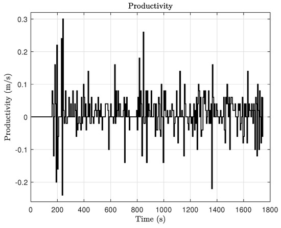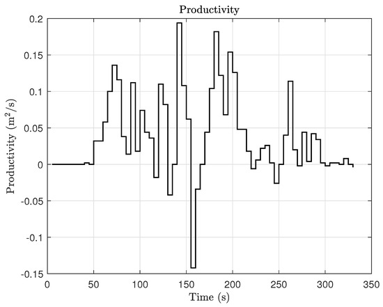 The update rate of the elevation map from surrounding areas is equal to 5 s. The actual productivity of the excavator in the grading operation is illustrated in Figure 16. In this operation, the mean value of actual productivity (including positive and negative values) is roughly 0.03 m/s. As can be seen, the productivity occasionally falls below zero. In actuality, negative productivity may result when the difference between the desired and actual heights exceeds the required accuracy. For example, it occurs when a large quantity of materials falls from the bucket onto a part that has already been graded or when the bucket goes too deep, and the error exceeds the threshold.