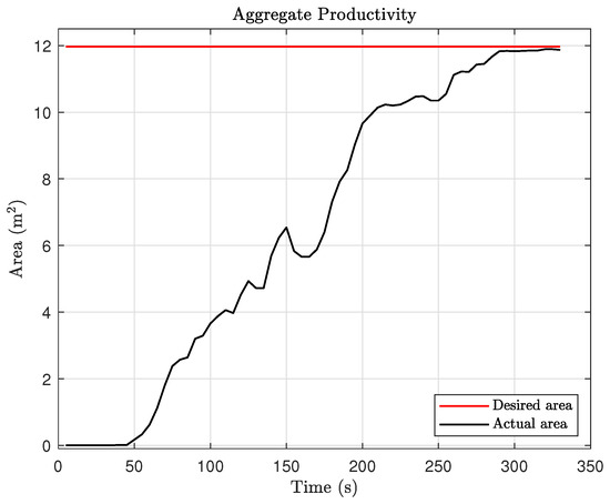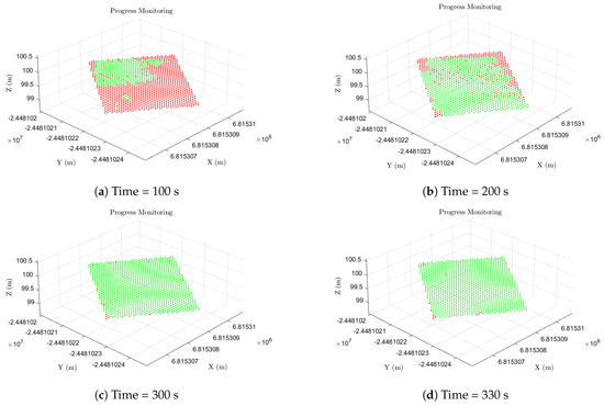 The aggregate productivity of the excavator in the grading operation is shown in Figure 17. The whole area of the target model is approximately 12 m. In some parts, the aggregate productivity is decreasing because of the negative productivity in the operation. At the end of the operation, the aggregate productivity is approximately equal to the whole area of the target model. It means that, almost in the whole area, the error between the target model and the actual map is less than the required accuracy. Figure 18 monitors the progress of the operation at four different times. The sections with an error of more than the required accuracy are shown in red, and the points with an error of less than the required accuracy are presented in green. Using the presented algorithm, managers and contractors can easily monitor the productivity and progress of operations. This productivity information can assist project managers in time-scheduling and cost analysis. It is also feasible to detect issues and potential for productivity and efficiency improvements by comparing the productivity of the machine to industry standards or the productivity of other machines. Moreover, human operators can use the provided information as feedback to improve their skills and execute the operation with high accuracy in a short time.