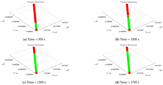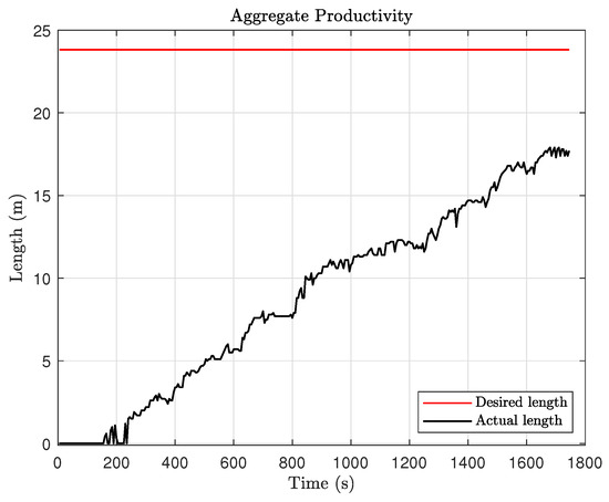 The aggregate productivity of the excavator in the trenching operation is demonstrated in Figure 21. At the end of the operation, the aggregate productivity is not equal to the whole length of the trench since, in some parts of the trench, the error between the model and the actual map is not less than the threshold. The progress of the trenching operation at four different times is monitored in Figure 22. As shown, the quality of the operation at the beginning and end of the trench is not enough since, at the beginning of the trench, the error between the model and the actual map is higher than the threshold, and at the end of the trench, because of safety reasons, the operation was suddenly stopped. The operator was not able to complete the operation.