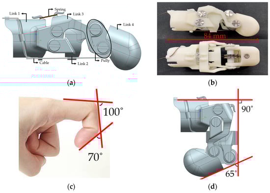 As shown in Figure 2a, the first link is designed to resemble the Proximal Phalanx of the finger, and it shifts the cable’s position from the palm side to the back of the hand. Moreover, a ring can be attached to ensure the finger prosthesis aligns with the diameter of the finger. The second link, similar to the Middle Phalanx, allows the prosthesis to be actively moved by applying direct force, depending on the situation of the patient with a partial amputation, and consists of a four-link structure, with the third link allowing the prosthesis to move like a real finger. The third link is connected to the first link with a rubber band, which allows it to return to its original state without a separate actuator after the cable is pulled. The final, fourth link is like the Distal Phalanx, fixing the cable and containing the pulley, which changes the direction of force during cable-driven operations.