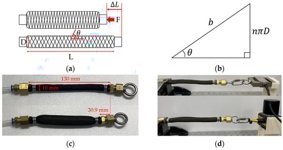 (a) Schematic of McKibben muscle. (b) The angle between the center line and textile , textile length b, the number of turns of textile n, diameter of actuator D. (c) Manufactured pneumatic actuator; deflation and inflation (). (d) Experimental setup to measure the force (CSBA-100k, Sensor solution, Republic of Korea) and length (CNH-500, COZY INTERNATIONAL, Seoul, Republic of Korea) of the actuator.