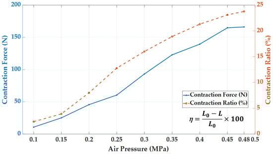 We manufactured a pneumatic actuator with a diameter of 10 mm and a length of 130 mm, as shown in Figure 4c. As shown in Figure 4d, we measured the tension and axial length change of the actuator according to the pressure, and the results are shown in Figure 5. The maximum axial length change is when the pressure of the actuator is 0.48 MPa. The physical model for the manufactured actuator can be represented as follows, by applying Equation (8).