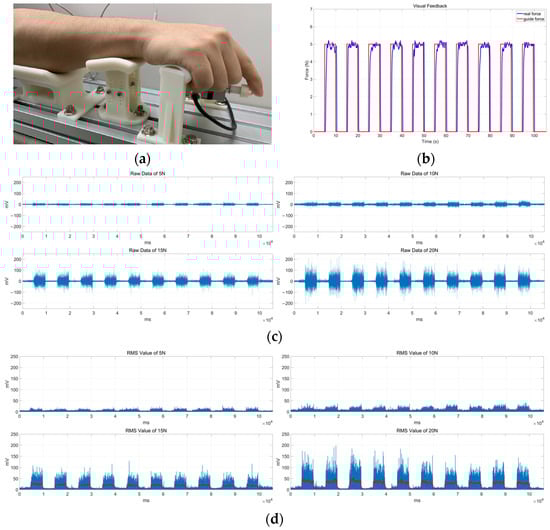 (a) Experimental setup to measure EMG signal. (b) Experimental result using visual feedback. (c) Measured raw sEMG data using visual feedback. (d) The result of RMS.