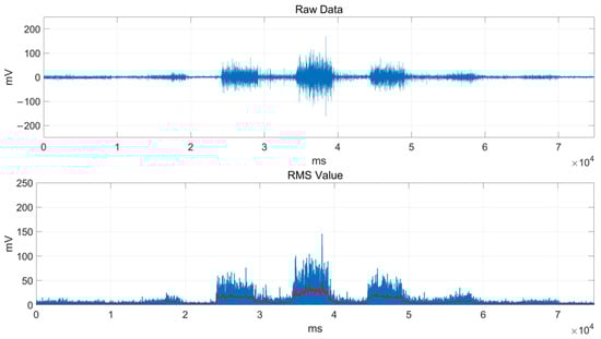 The effective bandwidth of the sEMG signal is known to be approximately 0.5 kHz, and sampling was conducted at 1 kHz according to the Nyquist sampling theorem []. Also, the test subject generated signals 10 times for 5 s each in a set of experiments, and this was repeated for five sets. The sampled signals were evaluated in size by the root mean square (RMS), as shown in Figure 6d.