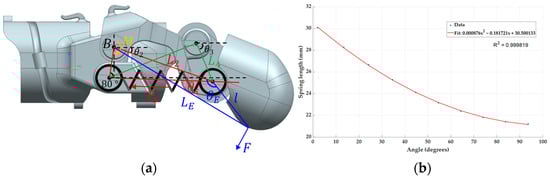 The parameters can be represented as shown in Figure 10a, represents the change in the spring’s length from its initial state due to the bending of the finger prosthesis. In this case, because the spring rotates to and changes its length as the finger prosthesis bends, the length with respect to can be expressed as follows. It was obtained using regression techniques as shown in Figure 10b.