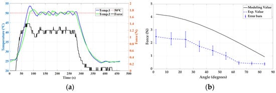 Figure 11a shows the temperature of the SMA and the force at the end of the finger when the proximal phalange and the distal phalange form a 90-degree angle. At this point, all external forces other than the SMA spring are excluded, and approximately 1.2 N of force is generated at the end of the finger when the SMA is activated. Figure 11b presents a comparison graph of the theoretical and experimental results according to the spring angle. It is possible to confirm the error between the modeling value and the experimental value because, due to the characteristic of the moment, the value varies greatly even with a small angle or length difference when measured.
