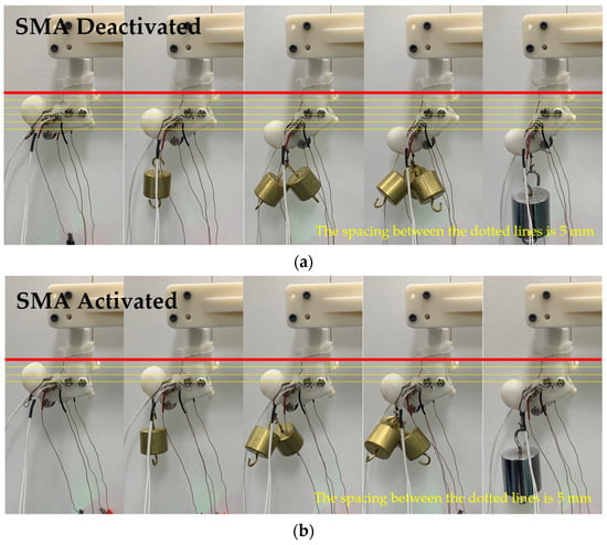 As shown in Figure 12, the weight at the end of the finger prosthesis was increased in increments of 50 g from 50 g to 200 g. When 200 g was applied during the activation of the SMA, the end of the prosthesis dropped by approximately 12–13 mm compared with when there was no weight. During the deactivation of the SMA, the end showed a drop of about 24–25 mm.