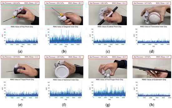 The results of the experiment can be seen in Table 4. When the RMS was between 3 mV and 5 mV, a minimum pressure of 0.1 MPa was applied to the actuator when the EMG signal was applied. For larger EMG signals, the pneumatic pressure could be applied in a continuous manner, and at this time, pressure changes less than 20 kPa have a minimal effect on the length change of the actuator, so minor changes in RMS values can be ignored.