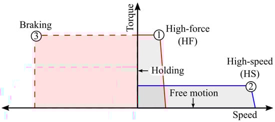 Thus, they are not well suited for stance phase requirements, especially when the robot needs to lift and carry heavy payloads. Alternatively, using EM with large reduction ratios to meet the stance phase requirements would limit the maximum velocity and increase the inertia and the friction [], thus penalizing the performance of the swing phase. Hence, designing a robot that can be used for all these operating points is not trivial and leads designers to compromise between multiple characteristics, as illustrated in Figure 1, when using a fixed reduction ratio.