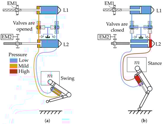 The proposed two-speed architecture consists of a lightly geared electric motor (EM1) and a highly geared electric motor (EM2) which are coupled to high- and low-pitch ball screws, respectively, that actuate two hydraulic cylinders. Those two cylinders—called leader cylinder 1 (L1) and leader cylinder 2 (L2)—are connected to a follower cylinder (output) on the leg, through a flexible hydraulic line. This results in a kinematically redundant system: the displacement of both the leader cylinders adds up to create a displacement at the follower cylinder (neglecting compressibility of the fluid) but the pressure is shared in the circuit. Additionally, two hydraulic valves can close the path to the lightly geared L1. Hence, this architecture permits two main modes of operation: a high-speed mode (HS) for fast movement and backdrivability when the valves are opened (Figure 3a) and a high-force mode (HF) when the valves are closed (Figure 3b). When valves are open, both L1 and L2 can contribute to the output motion. This results in high-speed capability and a low reflected inertia at the output, but with force limited by EM1. When valves are closed, only L2 contributes to the output since L1 is connected to a reservoir and can move freely. This results in high-force low-speed capabilities, as the configuration leads to a direct coupling of the highly geared piston to the follower piston. Furthermore, it is possible to generate large forces at high-speed using partial opening of the valves to restrict the flow in order to brake the system. Therefore, it is possible to reach operating points 1, 2, and 3 shown in Figure 2.
