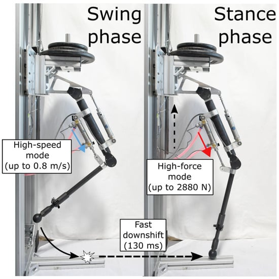 This article presents a multimodal actuation based on simple valves dynamically reconfiguring a hydrostatic transmission. As illustrated in Figure 3, motorized ball valves are used to dynamically reconfigure the system between two operating modes tailored to the swing phase and stance phase. The concept is similar to the two-speed architecture explored by Verstraten [] and Girard [], but in the fluidic domain. The salient feature is that ball valves replace the high-force brake and the differential that were required in the mechanical domain, reducing the number of cumbersome components while increasing the flexibility in terms of conditions in which the system can downshift. This article is built on preliminary results presented in a conference paper [], which analyzed opportunities to save mass and increase efficiency of actuation system using multimodal hydrostatic transmissions. Here, a thorough analysis of one of these opportunities is presented: using high-speed/high-force mode switching. The mass saving analysis is expanded with an exploration of the trade-off between size, speed, and flow for the valves. Furthermore, this article presents a working prototype, experimental results on a 2-DoF leg test bench as shown in Figure 4, control challenges and solutions, practical issues, and limitations, which were not discussed in the preliminary conference paper.