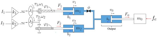 with ,  and , representing piston masses plus the inertial contribution of the transmission fluid in linear units at the piston;  and  represent the inertia of the motors; , , and  represent speed-dependent dissipative forces acting on the output, the L1 piston, and the L2 piston (friction in the seal, the ball screw, and head loss in the fluid lines), respectively;  and  represent the electrical currents in the motors;  and  represent the motor torque constants;  represents an external force acting on the output; and  represents a dissipative force acting on the L1 piston caused by partial closing of the ball valve. This controllable dissipative force can be modeled with: