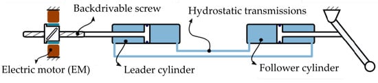 The proposed two-speed design (Figure 3) is compared with a baseline hydrostatic one (Figure 6), which inspiration is drawn from [,]. Mass and efficiency analyses are conducted for both designs meeting the requirements of all three operating conditions. The mass is found through the following steps: (1) computing the most advantageous reduction ratio for each configuration given the requirements, (2) computing the individual requirements (force, speed, power) of the components (cylinders, valves, ball screws, and motors) for each configuration; (3) using the scaling laws for estimating the mass of components. The approach, hypotheses, and inputs are detailed in Appendix A.