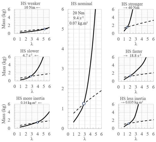 The crossing point is sensitive to the HS mode torque and inertia because the required motor size strongly depends on the torque-to-inertia required to fulfill all operating conditions. The crossing is less sensitive to the target speed here but in other cases (which depend on the motor family and target specifications), the speed may constrain the design before the reflected inertia.
