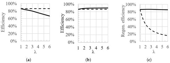 Efficiency comparison of the baseline configuration (solid black) with the proposed two-speed solution (dashed black). (a) High-speed mode; (b) high-force mode; (c) high-force mode.