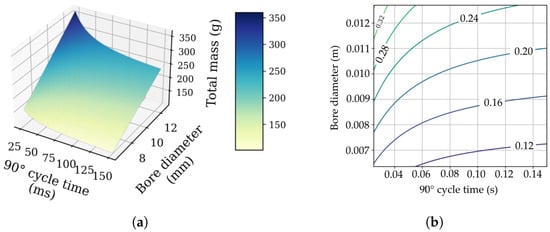 Mass mapping for aluminum motorized ball valves as a function of the bore diameter and 90° cycle time: (a) 3D view of the map; (b) 2D view of the map.