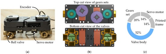 Motorized valve unit prototype built with two commercial three-way ball valves and servo motors. (a) Actual prototype overview; (b) top and bottom cut views; (c) mass distribution.
